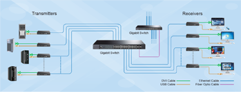 Distributed KVM Mode: Because each receiver can connect to any transmitter on the Gigabit network, a set of transmitters and receivers behaves like a matrix KVM switch. At the receiver level, a user can select which transmitter on the network he wants to connect to by using OSD menus, exactly the same way as with a conventional monolithic KVM switch.